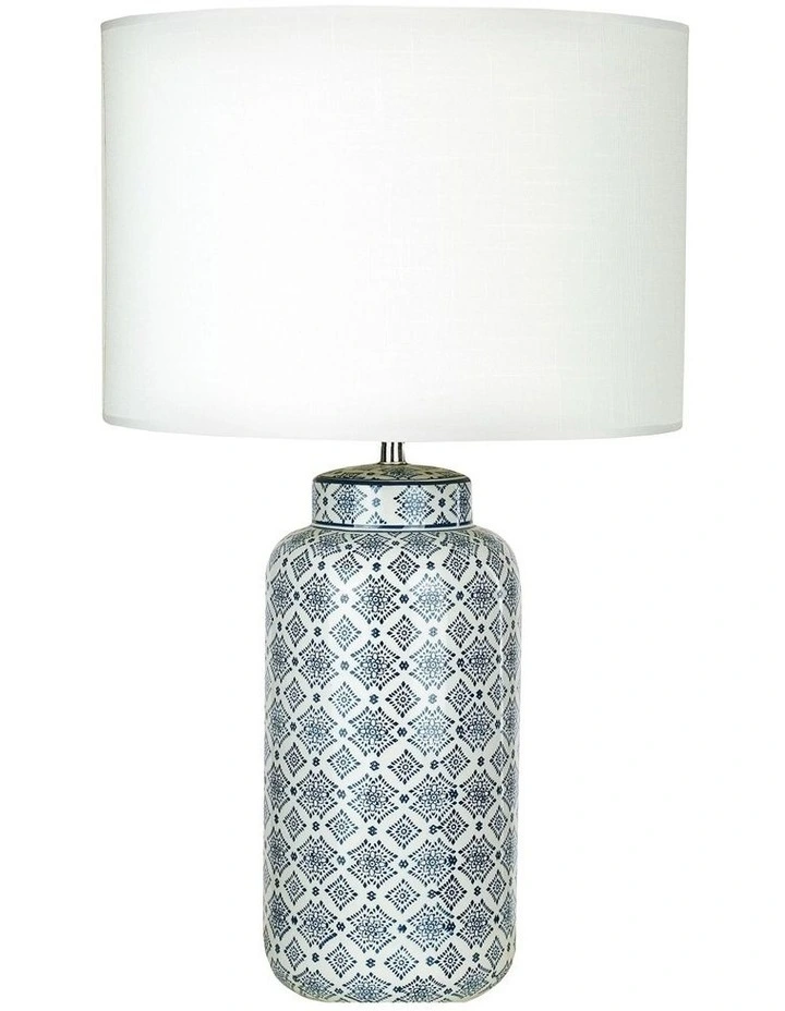 The Afra Table Lamp is an elegant porcelain ceramic desk lamp, features a plain white fabric drum shade and cylindrical base with a blue and white geometric pattern. * Indoor Use Only.
