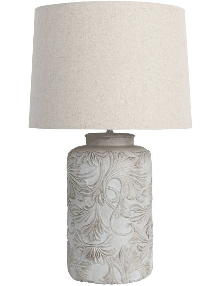 Andorra whitewashed, faux timber finished table lamp base features a lovely floral relief pattern. Supplied complete with a flax linen hardback lampshade. A beautiful addition to a contemporary or traditional home. The switch is conveniently located on the cord.