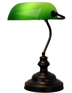 Traditional bankers lamp in black with a dark green glass shade. On/Off Touch switch.