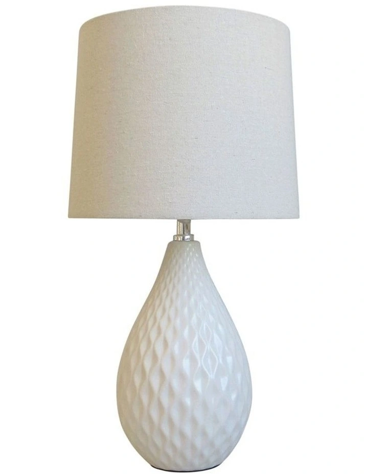 The Danu white textured ceramic table lamp comes complete with a tapered fabric drum shade. This sleek lamp is perfect for a bedside or study nook in a modern or hamptons styled home. The on/off switch is located on the cord.