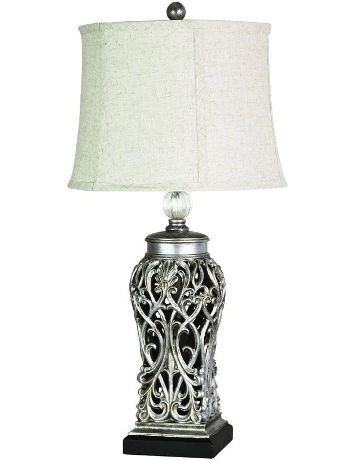 The classically styled Dorne table lamp features a unique antique silver filigree base and glass bead beneath the hand made shade. Perfect for any home, the Dorne is complete with a soft back raw linen shade. A stunning finial knob finishes this classic lamp. The switch is conveniently located on the cord.