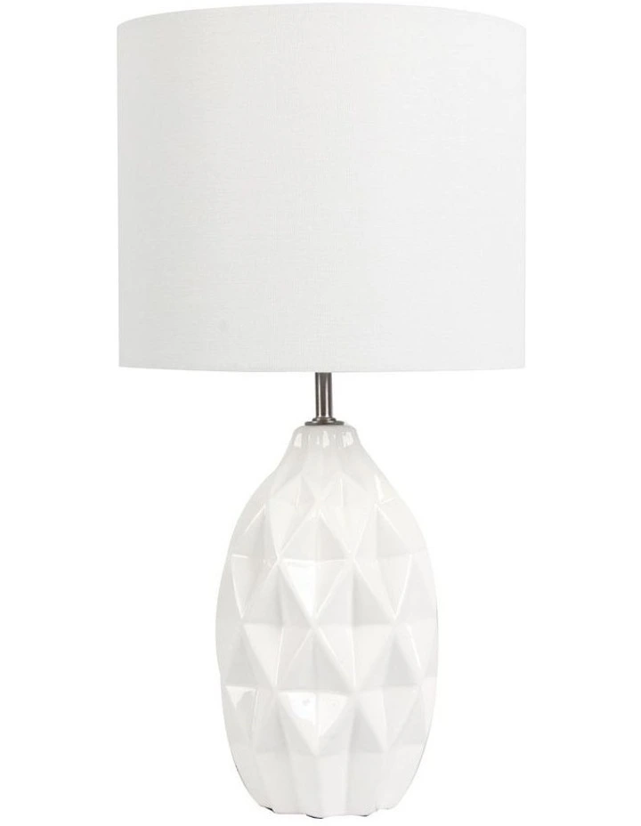 JORN geometric table lamp is finished in a glossy ivory glaze. The ceramic base is suitably matched with ivory-linen drum shade. The very stylish piece would sit nicely in a coastal, classical or contemporary home.