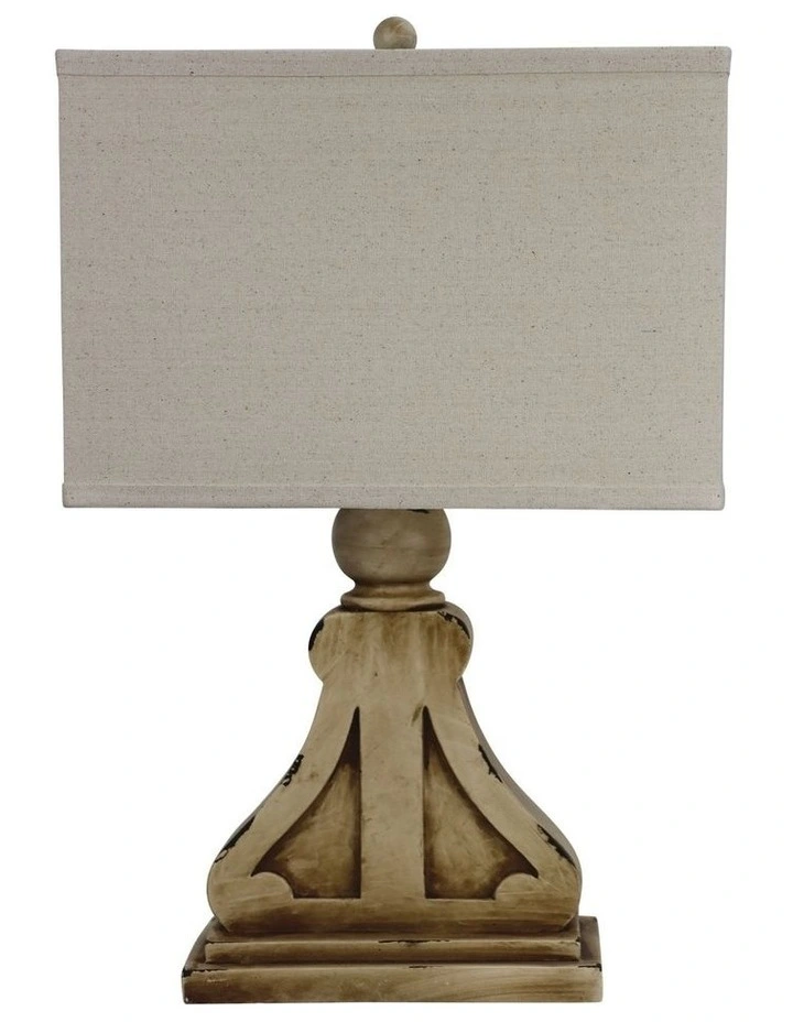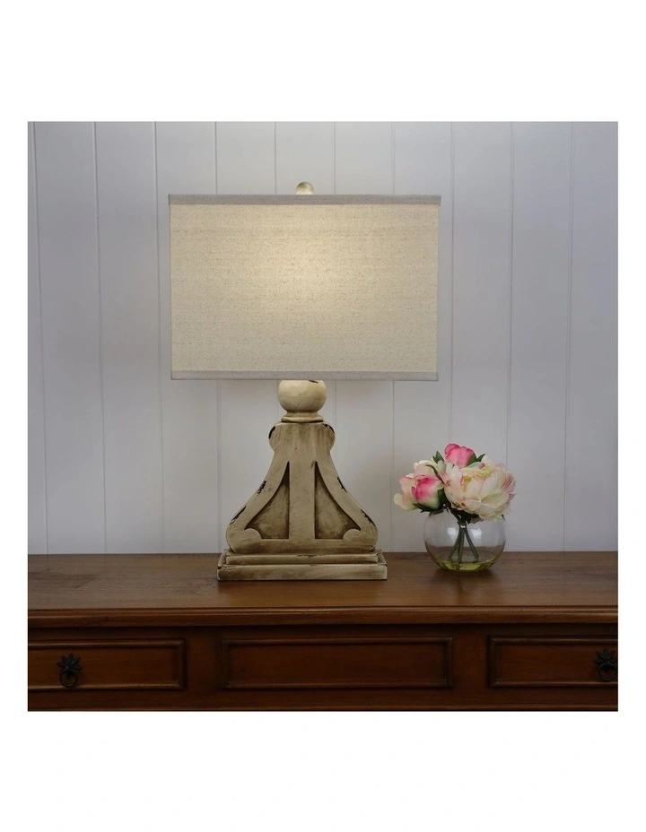 The Provence wood-tone resin table lamp comes complete with an off-white shade. At 65cm tall, the Potton is a statement piece that can adapt to most rooms in your home. The on/off switch is located on the cord.