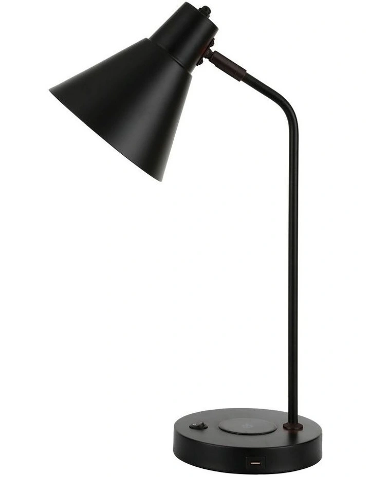 TARGA is an ideal task lamp for desk or bedside. A USB socket for charging devices is positioned on the side of the base. Or charge wirelessly by placing your phone on top of the base. Available in black or white, with a wide adjustable shade perfect for task lighting. On/off switch is located conveniently on the base. Ideal for use with opal LED globe.
