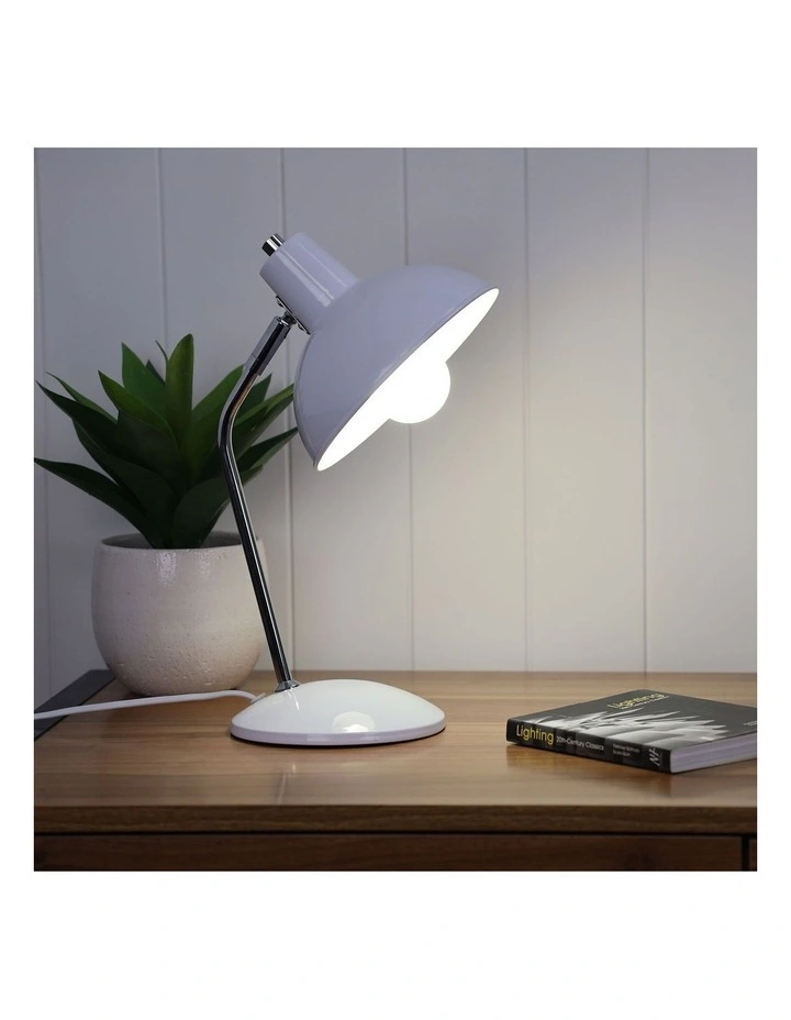 Welcome mid-century style into your home with the softly curved white and chrome THEA lamp. The adjustable head makes it perfect for use as a task lamp or a bedside reading light.