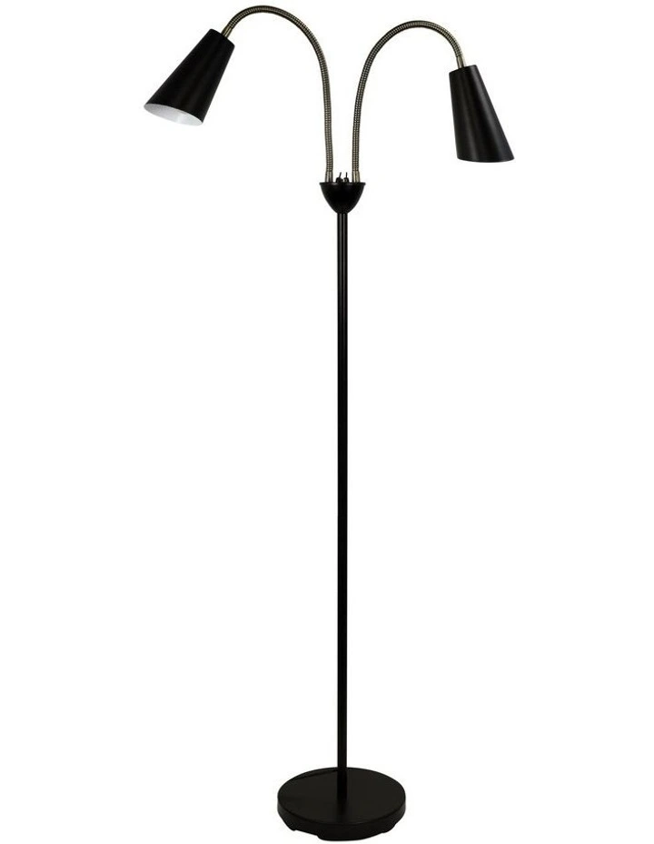 WALT is a mid-century styled twin floor lamp featuring flexible goose-neck arms with metal shades. WALT’s individual switches are located on the central hub, for easy access to operate each light separately. WALT is finished in matt black with antique brass highlights. Shades have a white painted inner, providing better light reflection.
