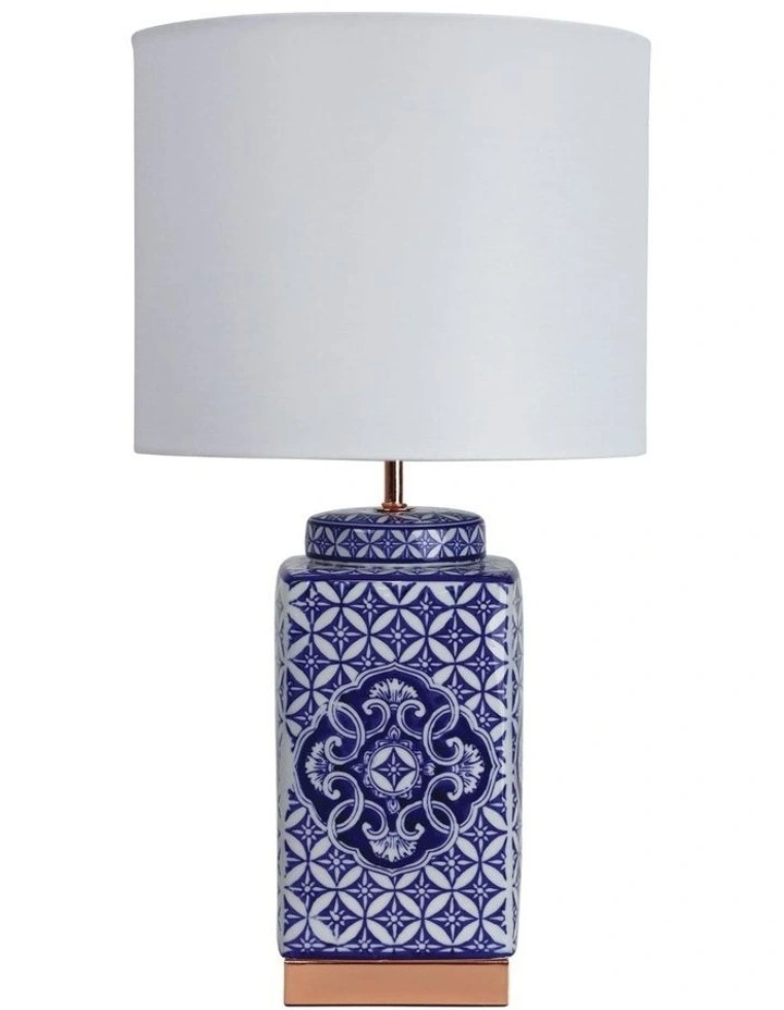 The Xian blue patterned ceramic table lamp comes complete with a white shade. At 57cm tall, the Xian is a large statement piece that can adapt to most rooms in your home. The on/off switch is located on the cord.