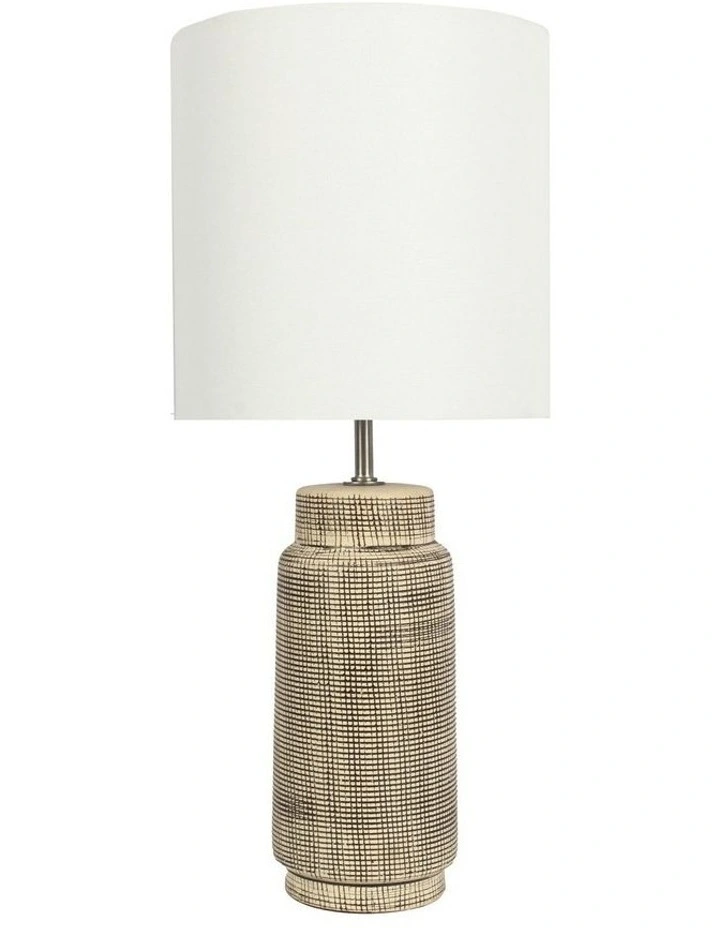 A tall, beige, base with inscribed, brown-black cross-hatching, a long brushed-chrome neck and an ivory linen drum shade make up the ZAMORA ceramic table lamp. Very retro.