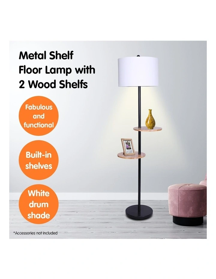 The metal base ensures stability and durability, making this floor lamp an overall excellent buy. This shelf floor lamp also works well with 60-watt E27 bulbs (not included) so you can create the perfect mood for your space. Its white drum shade casts an even, diffused glow and makes this lamp ideal for both functional and ambient lighting.
